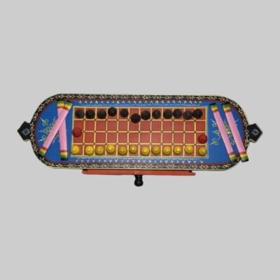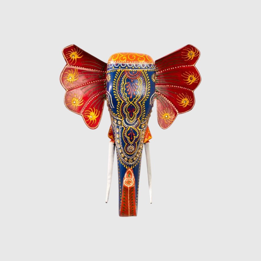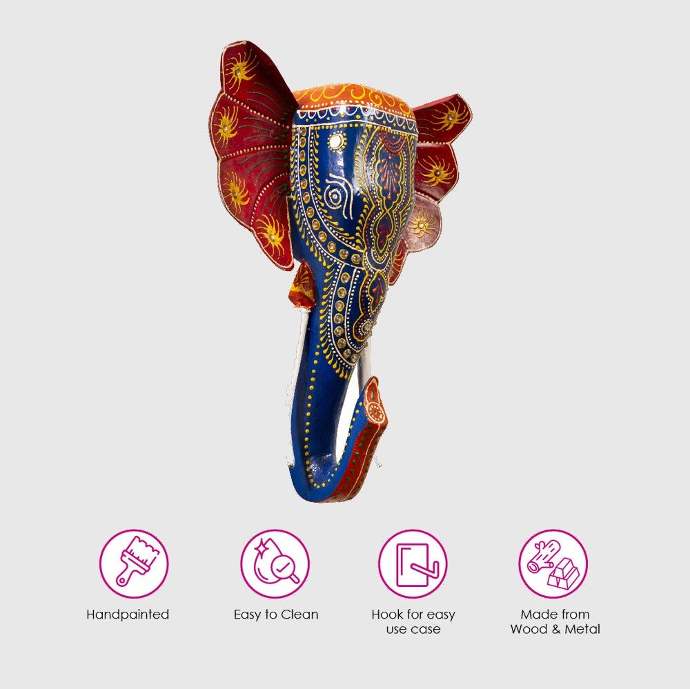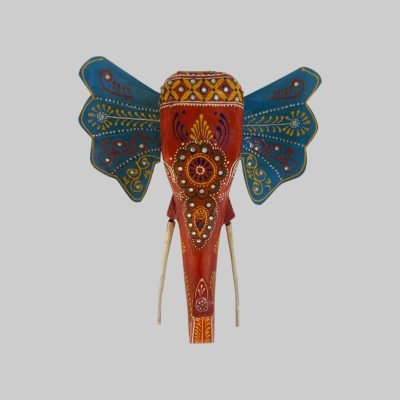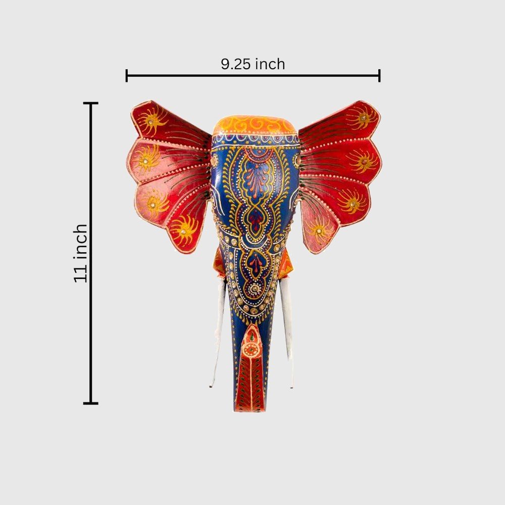 A wall hanging of a elephant in the traditional Cheriyal art form in red and blue motifs.